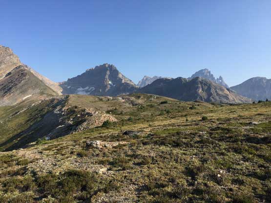 Because the fact we planned this trip in a 3-day period there’s absolutely no reason to rush on our summit day. The entire ascent should be done without having to touch snow so I didn’t see a point of making an “alpine start”. Mike and I agreed to wake up at whenever we wanted and that ended up being a 9 am wake up time… Our morning routine was fairly efficient and we eventually did manage to get going before 10 am. This was alright as I was still tired from this month’s pushing through… The 450-m scree slog to a high col on the south shoulder of Mt. Fryatt looked terribly tedious but actually not that bad. The scree wasn’t entirely treadmill plus we managed to pick up some game trails here and there. The final 100 m involved a bit of “moderate scrambling”. The route wasn’t that obvious but I believe there are more than one line that goes. The shoulder is a very scenic site to linger and soak in the views.