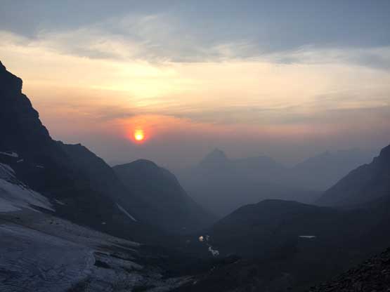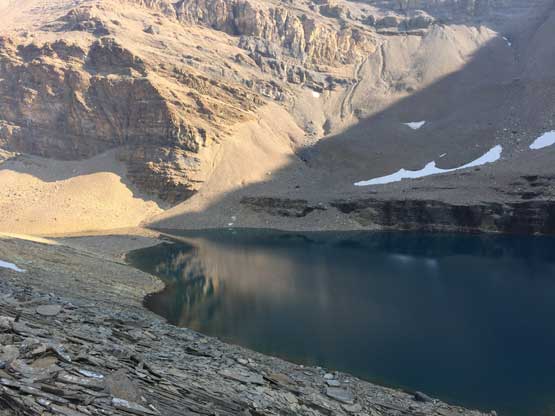 From the saddle what’s left was a 450-m plod down to our basecamp at Iceberg Lake. Other than the initial 100 vertical meters (“moderate scrambling”) the rest was mostly scree skiing. The scree wasn’t the nicest but anyhow it’s hard to complain about it. Back to camp we earned ourselves a bit over 2 hours of daylight time so after cooking dinners I went to search for some sunset views. The lake’s outflow had some neat colours and I stayed there for about half an hour taking pictures. The night was peaceful and relaxing and the next morning we did not set up an alarm neither. We would sleep till whenever we wanted. The reason was simple – why not…