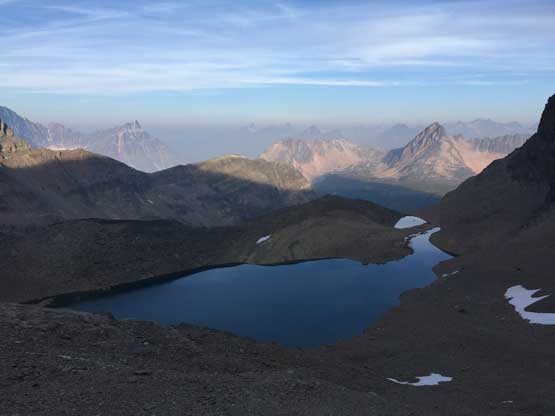 The next stage was a very foreshortened off-trail slog to that broad, grassy skyline ridge in front. It looked close but actually terribly far away with some significant elevation gain, that once we crested the ridge we all needed a lengthy break. At this point we still had about 2 hours of daylight time so the decision was pushing to the SW Face’s bivy at “Iceberg Lake”. Mike has his first-hand knowledge of this stretch and he warned me it’s shittier than I might think. Mike was right. I did not enjoy any fraction of this part of the plod. The first stretch was a long ass side-hill bashing on steep grass and hard-packed scree with some exposure. Technically speaking it’s easy, but every step required concentration. A slip on this grass bench isn’t an option. After the side-hilling we had to deal with a long plod on unstable rubble. We had to “overshoot” the outflow of Iceberg Lake by roughly a kilometer before finding a weakness in the cliffs immediately to our left. The ascent through this weakness followed by another side-hilling traverse was entirely on unpleasant terrain. Arriving at a well-built tent pad on the shore of Iceberg Lake was quite a relief. I was beat and seriously needed a break. Mike volunteered to find some running water at the lake’s outflow while I managed to get the tent erected. It took Mike a good while to fill up the water bottles because that lake’s outflow was quite far away. The rest of this night was spent doing the evening routine and then sleeping… I was to spent to play around this lovely site.