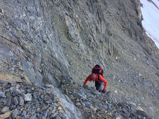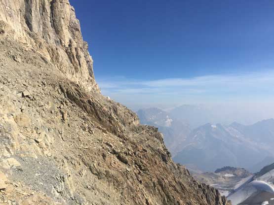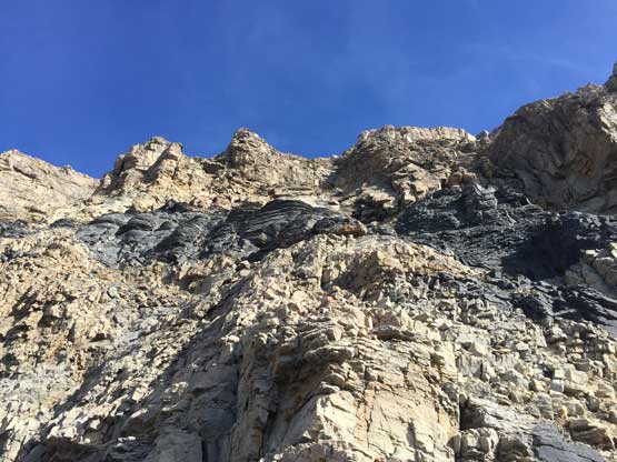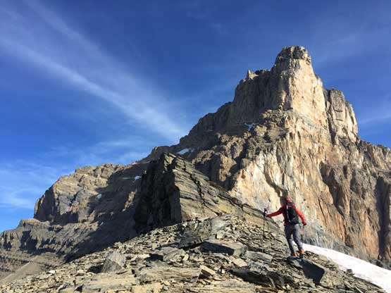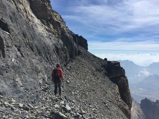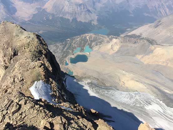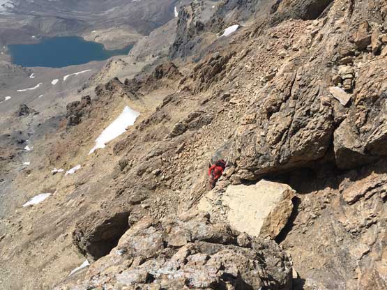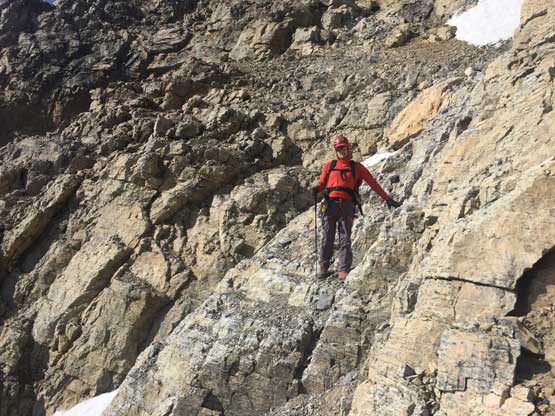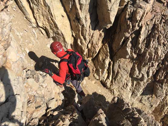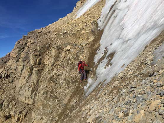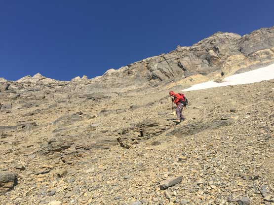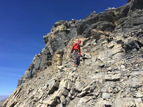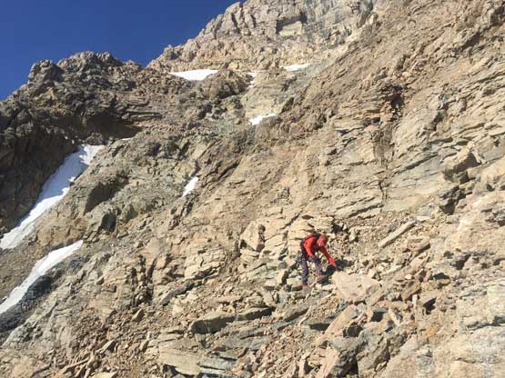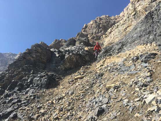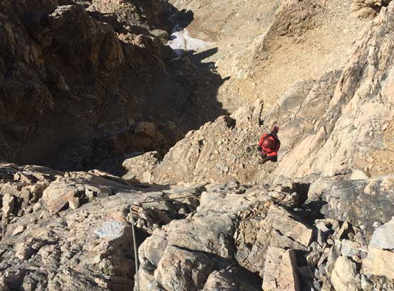 Despite the delays in route-finding we were still doing good on time. We stayed for almost an hour soaking in the views before starting the descent. After easily reversed our ascent line off the summit block we arrived at the first rappelling station. From there we did two full 30-m pitches of rappelling off the technical terrain. There’s another anchor at the bottom that we skipped. Mike found a scramble route and we managed to get off the yellow band by a bit of 4th class down-climbing. This got us dumped down-climber’s left of the major ice gully that we were too scared to cross on ascent. I was 100% sure we were now on the correct route so insisted to not cross that gully. This would involve descending the lower SW Face on “unfamiliar terrain” that we hadn’t gone up but let’s face it. I think we did fairly well finding the easiest route and managed to stay within “3rd class terrain” for much of the lower face. Traversing back across that black choss bend still sucked balls but at least short-lived. In no time we were back to that high saddle taking another lengthy, but much-deserved break. The descent was a lot easier than anticipated.