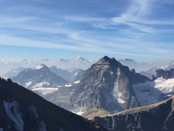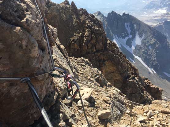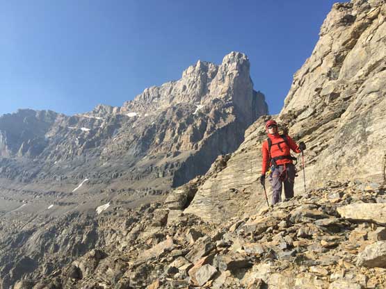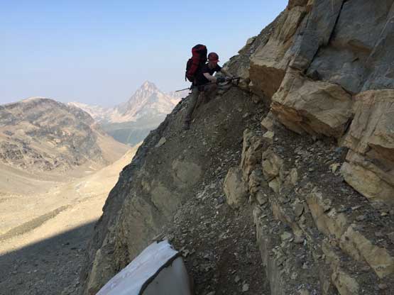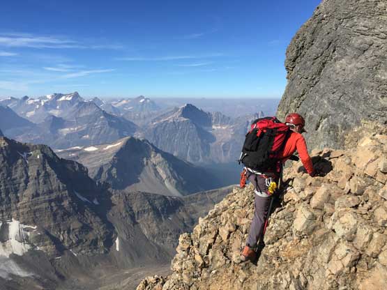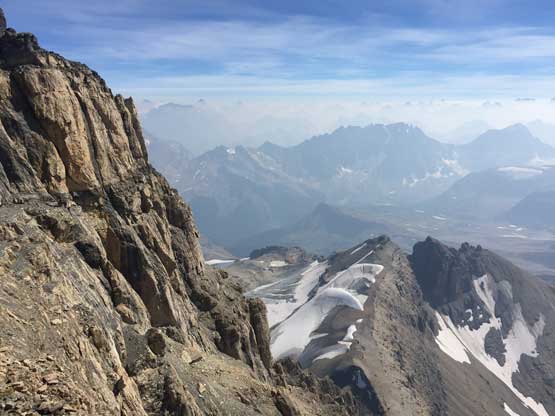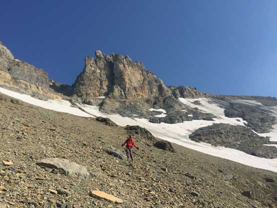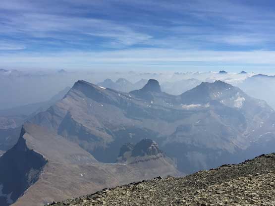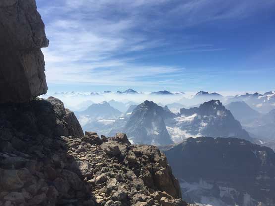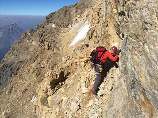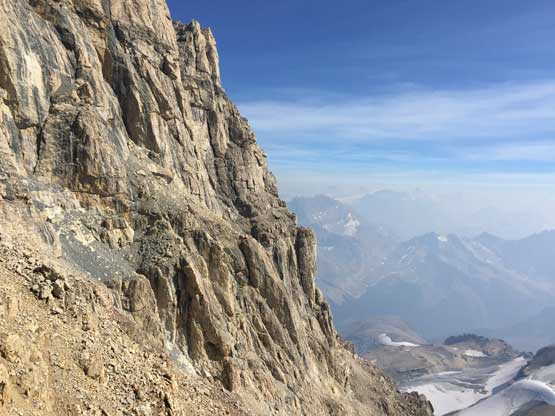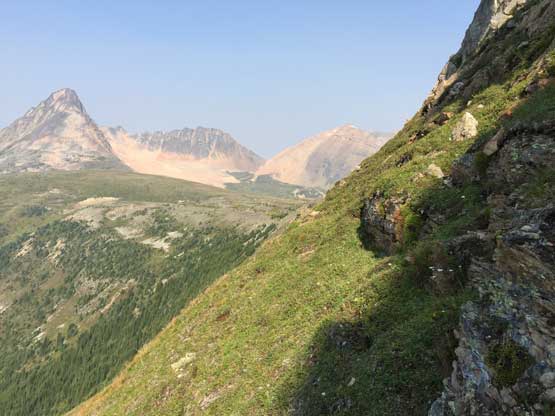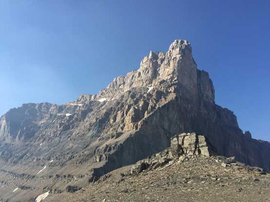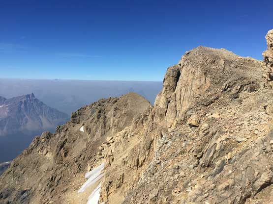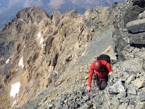 Despite the delays in route-finding we were still doing good on time. We stayed for almost an hour soaking in the views before starting the descent. After easily reversed our ascent line off the summit block we arrived at the first rappelling station. From there we did two full 30-m pitches of rappelling off the technical terrain. There’s another anchor at the bottom that we skipped. Mike found a scramble route and we managed to get off the yellow band by a bit of 4th class down-climbing. This got us dumped down-climber’s left of the major ice gully that we were too scared to cross on ascent. I was 100% sure we were now on the correct route so insisted to not cross that gully. This would involve descending the lower SW Face on “unfamiliar terrain” that we hadn’t gone up but let’s face it. I think we did fairly well finding the easiest route and managed to stay within “3rd class terrain” for much of the lower face. Traversing back across that black choss bend still sucked balls but at least short-lived. In no time we were back to that high saddle taking another lengthy, but much-deserved break. The descent was a lot easier than anticipated.