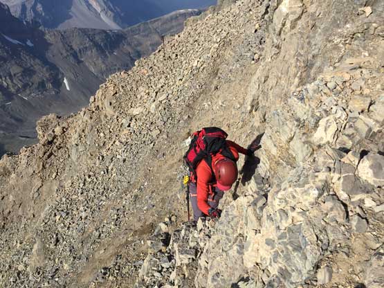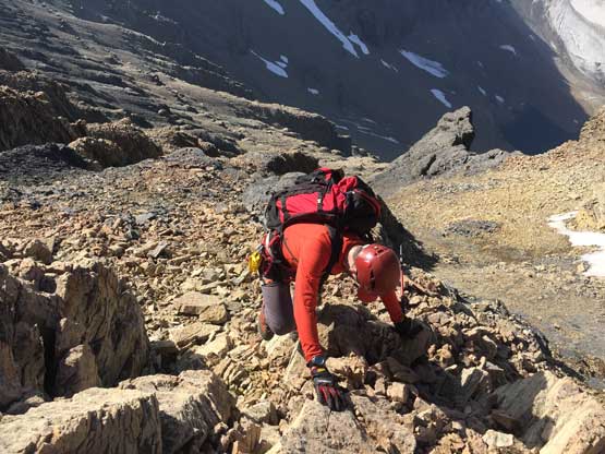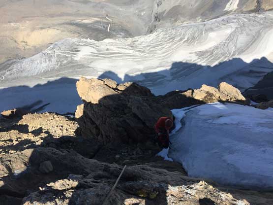 Aiming towards one of the several notches on the higher west ridge we could sense the terrain’s getting harder and harder. It seemed apparent that we’d run into 5th class terrain on the yellow ish rocks but I did not recall the same position from Vern’s trip report. I thought for sure Vern’s group was one gully climber’s right of us but to cross this gully we had to step onto dirty ice. We strapped the crampons on anyway and made a half hearted attempt. I did not like it. The Petzl Irvis Hybrids felt undertooled plus we had fresh beta that we should not encounter snow/ice at all. After some discussion Mike and I agreed to explore the climber’s left side of this gully even though we knew this was likely off-route. After fighting our ways up a long section of sustained and very loose 4th class choss I made the call to pull the ropes out. There wasn’t much indication of past human traffic and the pitch ahead looked nothing “scrambling”. I had to build a trad anchor (one size 0 cam and a micro nut), switched to rock shoes and led a short, but solid pitch of 5.6 on good-ish rocks. There’s a big boulder above the steep pitch that I used to belay Mike up. Mike had no problem to second this pitch but the two pieces of pro that I used to build the belaying station were forever donated…