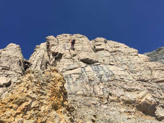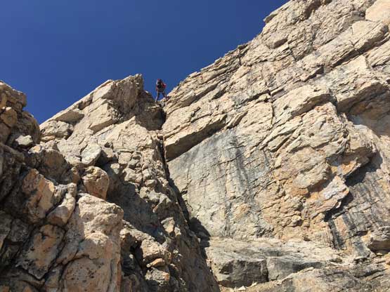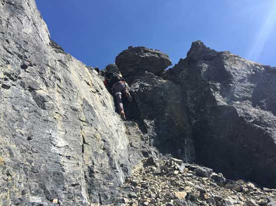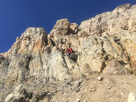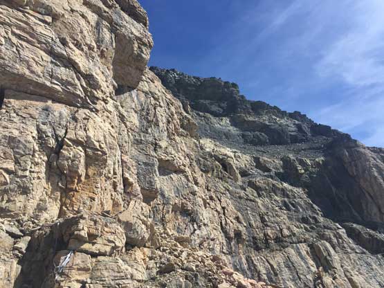 The ascent of SW Face consists of two stages in my opinion. The first stage is a rising traverse aiming for the high end of West Ridge and the second stage involves two short pitches of 5th class climbing and then the summit block. The first stage is the most confusing as we had little idea where exactly to go along this “rising traverse”. I did not do much of research other than reading Vern’s trip report because Mike had a GPS track. Our plan was to follow that GPS track along with Mike’s memories from this past attempt. After traversing along the wide brown bench (with a game trail) we found a shallow gully ascending onto a shitty black bench. The traverse across this black bench sucked balls. We did not start gaining elevation until we’d crossed several large gullies all the way over to the far climber’s left side of the face. At one point Mike instructed us to finally start going uphill and as expected, the face started out easily with nothing harder than 3rd class with occasional 4th class steps. The exposure was moderate and the rocks were reasonable by Rockies standard. Upwards and onward the terrain stayed in this form for a long while.
