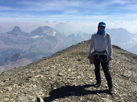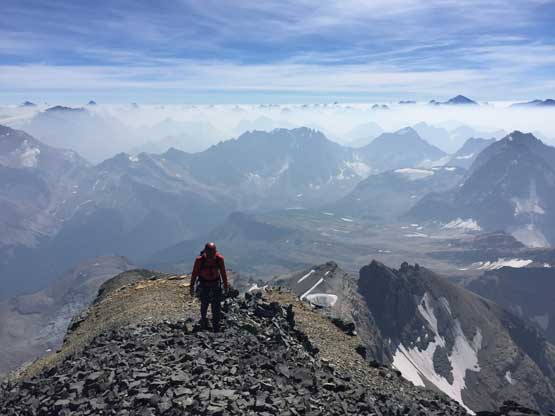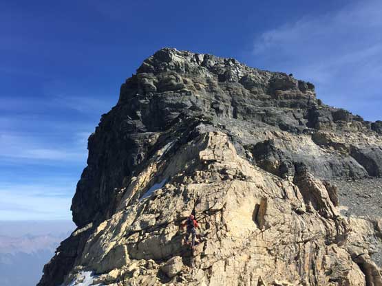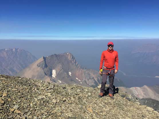 With the technical pitches officially over we stared at the summit block knowing the route shouldn’t go any harder than 4th class anymore. Mt. Fryatt is almost in the bag. Mike went ahead to attack the next step along the crest of west ridge. It looked harder than it actually was – mostly just 3rd class and only moderately exposed. Then at an obvious black bench we traversed all the way over to the south side of summit block and found a shallow 3rd class charcoal gully. Ascending this feature got us dumped right on the summit ridge and the summit was only two minute’s walk from there. The view was magnificent but even better, 52/58 down for me and only 6 to go!