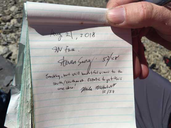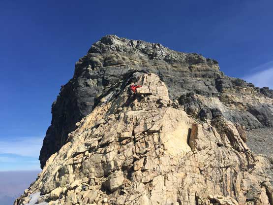 The terrain then forced us traversing farther climber’s left onto a flat shoulder of the upper west ridge. Much of this stage was 3rd-4th class but very exposed so instead of pitching out I decided to short-rope Mike up. We then briefly ascended the crest of west ridge before traversing an obvious ledge back onto the SW Face. At least two rappelling anchors indicated we were back on route, but unfortunately we screwed up the next pitch again. I could not figure out how exactly Vern’s group managed to keep the terrain within “5.2” and lost my patience to farther look around. I called for a belay and then went for whatever that felt reasonable following my own route-finding. This led to a awkward corner with two or three strenuous moves probably at 5.7 grade. I barely made it up on my rock shoes and then ran a full rope length to another big boulder. A top anchor was soon built but as expected, Mike had big issues climbing that corner step in his mountaineering boots. After attempting a few times Mike decided it’s over despite the top-rope belay. Not good… There’s nothing I could do other than pulling the ropes up but I told Mike to give it one last try by exploring far out onto the north side. This decision changed the game. The immediate north side of west ridge was a mostly 4th class, albeit exposed pitch. I think we found a better bypass than Vern’s 5.2 face route on the second pitch.