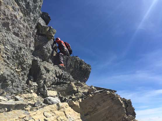 Despite the delays in route-finding we were still doing good on time. We stayed for almost an hour soaking in the views before starting the descent. After easily reversed our ascent line off the summit block we arrived at the first rappelling station. From there we did two full 30-m pitches of rappelling off the technical terrain. There’s another anchor at the bottom that we skipped. Mike found a scramble route and we managed to get off the yellow band by a bit of 4th class down-climbing. This got us dumped down-climber’s left of the major ice gully that we were too scared to cross on ascent. I was 100% sure we were now on the correct route so insisted to not cross that gully. This would involve descending the lower SW Face on “unfamiliar terrain” that we hadn’t gone up but let’s face it. I think we did fairly well finding the easiest route and managed to stay within “3rd class terrain” for much of the lower face. Traversing back across that black choss bend still sucked balls but at least short-lived. In no time we were back to that high saddle taking another lengthy, but much-deserved break. The descent was a lot easier than anticipated.