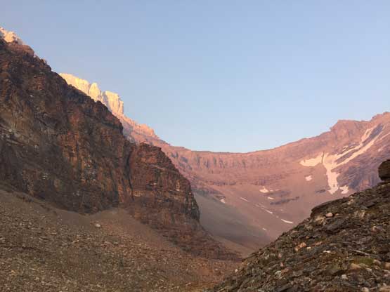 From the saddle what’s left was a 450-m plod down to our basecamp at Iceberg Lake. Other than the initial 100 vertical meters (“moderate scrambling”) the rest was mostly scree skiing. The scree wasn’t the nicest but anyhow it’s hard to complain about it. Back to camp we earned ourselves a bit over 2 hours of daylight time so after cooking dinners I went to search for some sunset views. The lake’s outflow had some neat colours and I stayed there for about half an hour taking pictures. The night was peaceful and relaxing and the next morning we did not set up an alarm neither. We would sleep till whenever we wanted. The reason was simple – why not…