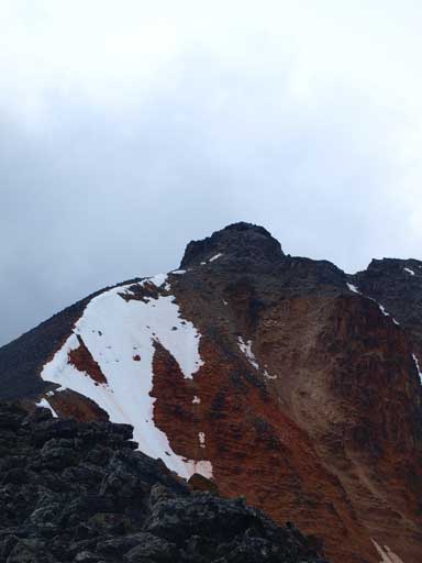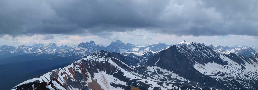 It was now that we saw another intense thunderstorm building up over Jasper townsite. It was moving south and southwest. We figured that it probably would miss us so why not give Mount Henry a go since it was right there. In case of getting caught, we could immediately bail down the south face. This mountain has probably the easiest bailing line among the four that we bagged on this day. We took another necessary break at the col, and once started gaining elevation on the other side, the theme continued, more and more boulders. We pretty much went up for as fast as we could (at least I did) to try beating this thunderstorm. Thankfully it indeed didn’t come our way, instead it hit Tonquin area.