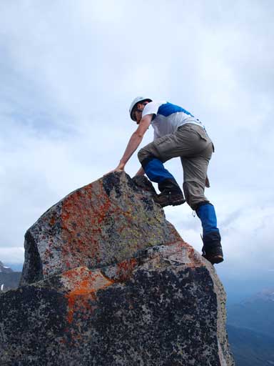 The true summit of Henry is a separate rock pinnacle that requires 1 or 2 technical moves. I thought we could just claim this peak without climbing it since it looked more like “summit boulder”. It’s a big boulder on top of the summit. However, once the sky finally decided to clear up, Ben and I took turn climbing up this pinnacle. It was easier than I thought. But climbing back down it made me feeling one long reach being a bit tricky. At least the holds were very solid.