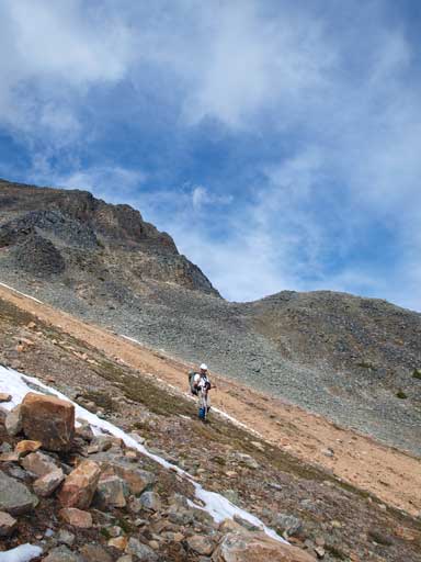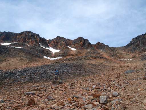 From the summit of Mount Kerr, we started the search for an alternate descent line that could bring us closer to Mount Henry. The west slope looked to be not too bad and we just picked it down. We also tried to maintain elevation and cut south to see if we could bypass the obvious rockwall that we saw earlier in this day. The boulders immediately down from the summit was loose and crappy. We had to be extra carefully with each footing. And thankfully, the rock band no longer exists on this side of the mountain, and after bypassing it we made to call of slogging back to ridge crest (south ridge), and followed it over another smaller bump, down a whole lot more boulders to Kerr/Henry col.