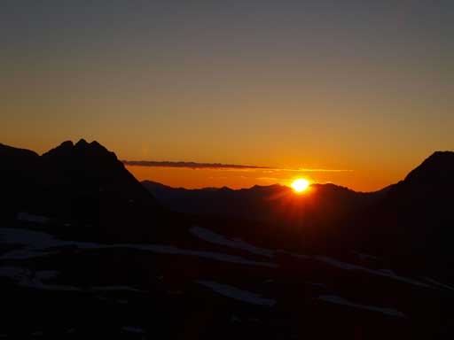 The next 3 hours or so was simply following the trail with head-lamps on. It was very well-maintained even at a couple rockier sections. After about 300m in we crossed a bridge over the raging Portal Creek. It was definitely more like a river right now. And then it was a steady hike along the side of this creek, for about 1 hour until we crossed another bridge over Circus Creek. With a bright half moon lighting up the sky, we knew we were already at the base of Peveril Peak. The trail then climbs up to its rocky slopes, contours around its slopes, and climbs up and over the broad pass between Peveril Peak and Lectern Peak. At this stage there was already faint brightness showing up behind the skyline. We could see the outlines of all surrounding peaks and it was such a peaceful environment. To our surprise, we still hadn’t encountered any mosquito yet. It also started to get very hot once we left the valley floor. With no sun, no bug, and no bush, I even took off my shirt.