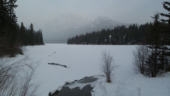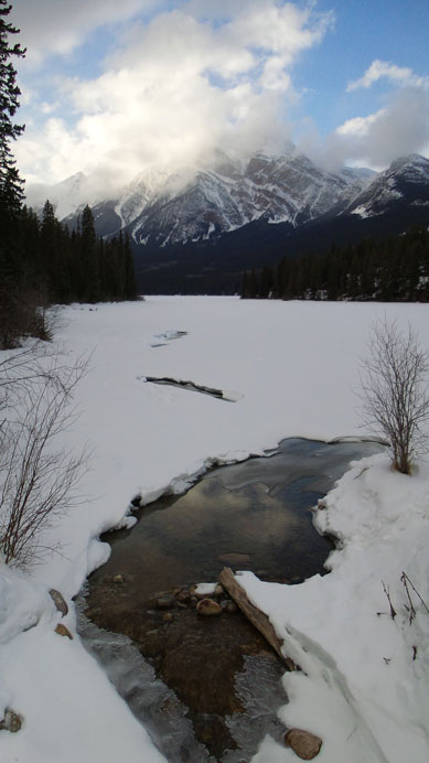 After waking up in miserable weather in Jasper townsite I decided to sleep in till whenever I wanted. Eventually I (somehow) managed to drag myself up. After a quick breakfast in A&W I drove up Pyramid Road. The last 2 km passing the Lodge was covered with fresh snow and I was the first one arriving at the parking lot on this day. With not-so-good spirit I started the long trek, with snowshoes in my backpack. The first 1.5 km or so was contouring around Pyramid Lake without gaining elevation. The road was essentially a cross country ski route so gets maintained often. It was rock hard so I figured it’s more efficient to boot the initial flat section. Once starting to gain elevation I strapped the ‘shoes on for extra traction. I was fully aware of the boredness so brought my iPod with full battery. That was crucial for surviving the hours and hours of foot numbing walk. With musics on time went by pretty fast and in short time I arrived at a smaller lake. By now the weather had improved significantly and I could see blue sky above.