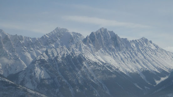 The groomed track stopped at shortly below the Y-junction, but luckily I was able to pick up a set of old snowshoe tracks which saved a lot of energy. Based on the post-holing suffer fest the day before I wasn’t really looking forward to any sort of trail-breaking on this day. At the Y-junction the snowshoe tracks turned right towards Palisade Lookout which was very good. But soon enough they stopped and I was left to my own. Thankfully the snowpack was way better in this area than in Willmore. The snowshoe penetration was about 10-20 cm and post-holing was minimal. But this section seemed to be freakin’ long. It’s only 3.5 km from the junction to Palisade Lookout but it was endless. Towards the end I followed this road climber’s right of an impressive rock face. There’s supposed to be a “Lookout” somewhere near the edge but I didn’t spend time looking for it. Here’s also the official end of this road/trail. The true summit of The Palisade lies near 2 km down the ridge.