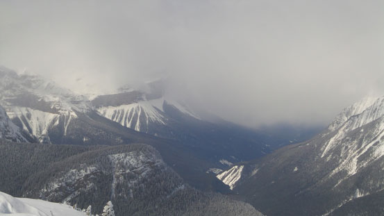 Though strenuous, the last 2 km’s ridge traverse was definitely the highlight of the entire trip. Firstly I contoured around the obvious rock face and found a break to re-ascend back to ridge crest. After that the rest would be simply following the ridge up, but getting to the true summit involved a fair amount of bushwhacking and post-holing. The ridge also narrowed down quite a bit higher up and on each side there were steep loaded slopes waiting to slide. I was forced to stay on the ridge crest overcoming tight and bushy sections, and higher up, big cornices here and there. And there were numerous false summits. Every time I thought the next one must be the true summit it turned out to be another false one… But on the other hand, weather held up nicely and I was awarded with some awesome views with the Colin Range stealing the show. Storms were hovering around Maligne and Parkway area throughout the entire day but blue sky and sunshine were above me and towards east. Pyramid Mountain marked the boundary between the two systems and I was happy to be just a couple km’s east of the boundary..