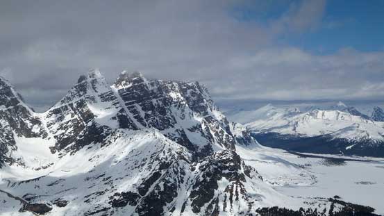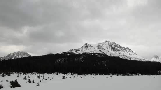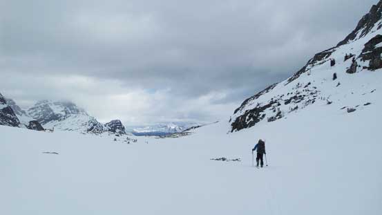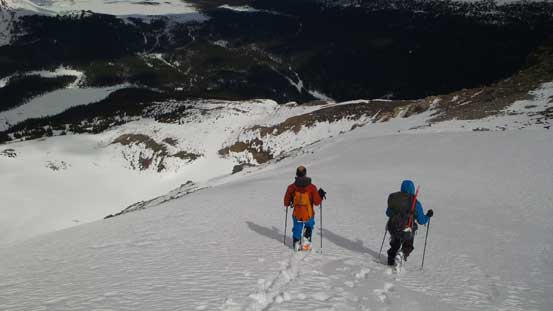 The way this peak looked suggested it probably wouldn’t be the greatest ski objective due to the bushy lower mountain and the rocky upper part. We figured if we ski far enough up Eremite Valley before cutting back along a ledge it’d be possible to avoid bushwhacking. Of course the first task was getting down to Eremite Valley. We picked a more direct line across Outpost Lake but the bush on the other side was horrible. I ended up removing my skis for another time.. Once down to Eremite Valley the travelling got much better. Liam again, set a blistering pace and I kept struggling keeping up with him. We went all the way past Arrowhead Lake before finding a reasonable route cutting left up the previously spotted ledge system.