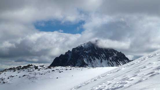 We had to traverse pretty much all the way back to the NW corner of this mountain. At one point we got too far up and ended up having to backtrack for a bit to avoid getting too close to the steep slopes. Eventually we rejoined the scramble route and at a giant boulder field we ditched skis. From here on there was still hundreds of meters of height gain and it seemed like this mountain was a lot bigger than it appeared. One advantage of doing it in April is the ability to utilize snow for as much as we could. It’s much easier to just kick-step up the snow face versus dodging the slippery boulders.. The snow slope got a big steeper towards the summit to give this peak a bit of “bigger” feel.