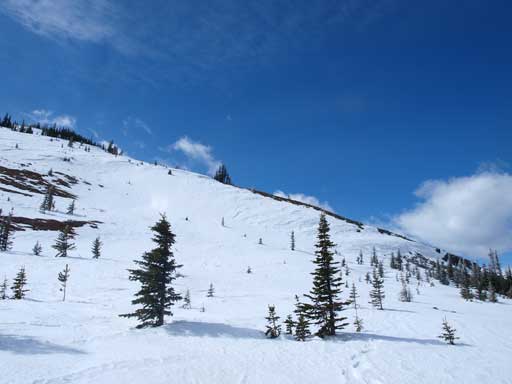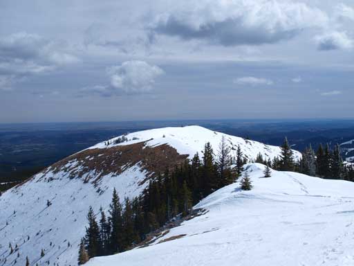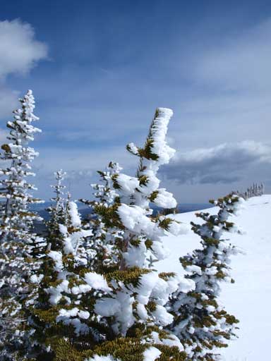 It was still very wintery in Kananskis probably because of the big dumps in the past few weeks. I was following hardpacked tracks so I didn’t need to strap snowshoes on until quite high. I definitely needed snowshoes on this day. Without them I wouldn’t even make to treeline. Since I was following tracks, route-finding was non-existence, and plus I was listening to music, there was not much to say except there are a few up-and-downs along the way. Near the false summit you will encounter a meadow area that’s steep enough to slide if loaded. On this day there wasn’t enough snow to slide, and I quickly made my way up to false summit, where the wind all the sudden picked up. The view was surprisingly good from this vantage point. I especially like the trees with frost on. A quick windy traverse brought me to the true summit which was ironically, partially treed.