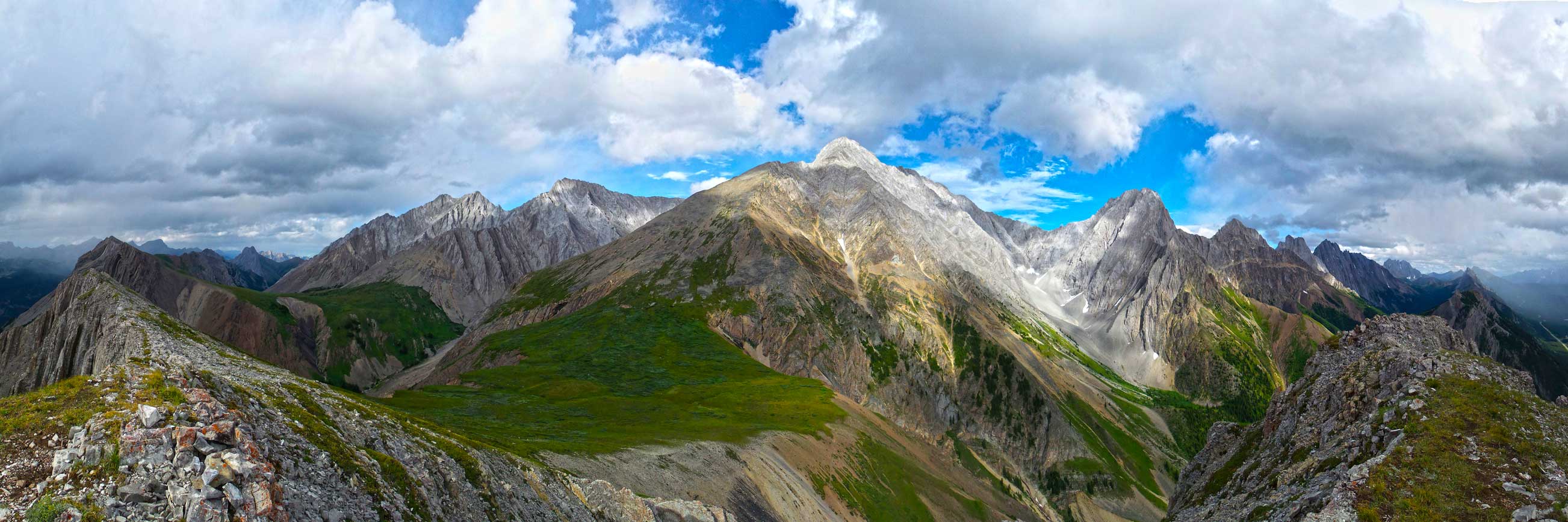 The part from Grizzly Peak’s south corner to Grizzly/Evan-Thomas col was very foreshortening and I was not mentally prepared for that. It took me much longer than it appeared, but on the positive side, weather held nicely and Mt. Evan-Thomas and Mt. Packenham got sunshine most of the time. Eventually I slogged to the col, but after gaining probably more than 2000 m on this day, the last bit from the col to summit also seemed to drag on for quite a while. It also appeared that another storm was moving in at a rapid pace, but I successfully beat it. I did not have time to sit around though, so after obligatory photos I immediately started the descent.