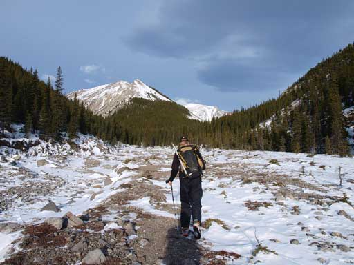 After a long time of hiking, we suddenly found a cairn on the left side of creek bed, and a faint snow covered trail. We didn’t know if we should follow this trail up but our logic was, it makes no sense if this isn’t the correct trail. So we left the creek bed and followed this trail steeply up forested slope. It didn’t take long to break through the trees, and now we were contouring around treeline towards the Bryant Lake.