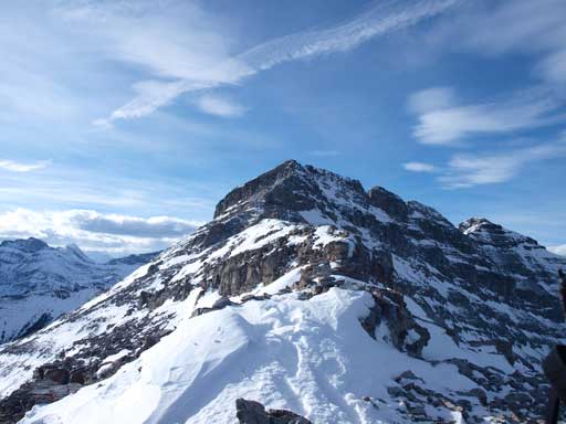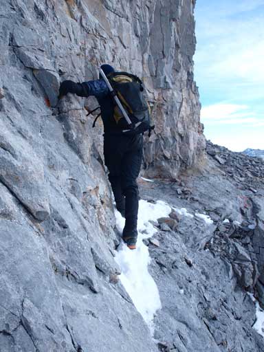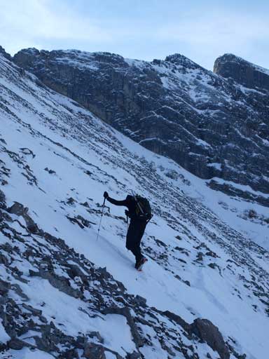 In order to avoid elevation loss, we decided to take a short cut over two short rock bands, and straight up the slope towards the summit. The rock hard and icy snow made things much trickier than anticipated. It could be much easier if we put crampons on, but oh well.
