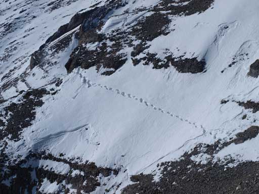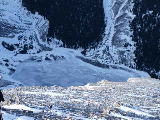 This step is not necessary, but the rock is very solid. Neil took the challenge while I descended on skier’s right side (only moderate level). I confirmed that the descend would work, but he needed to traverse towards my side after the most challenging moves as the last bit of his line was actually overhanging. I ended up ascending towards him and helped him selecting footholds, the holds are tiny at places. I’m very impressed. I’m sure this won’t be find in any scrambling book if it’s a must. After that we could aim for the “orange scree slope” described in Nugara book.