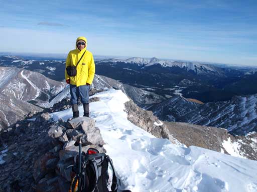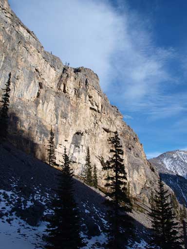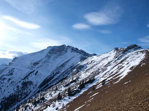 Due to the front range location, Elbow area was much less snowy. There was no need to bring snowshoes. We soon started the slog up Upper Canyon creek. Due to the snow cover, we didn’t bother to find a “path”, but just simply walked straight in. About 25min we made to the junction where the standard route leaves the main creek bed and goes up the right hand branch. We both wanted to try the difficult east ridge route but I voted for descending it rather than ascending, simply because I didn’t want to increase the chance of failure. The cruxes are near the summit so we wouldn’t get ourselves into trouble if the route doesn’t work. So we started the even longer slog up the right-hand-side branch. There’re a couple of boulder sections that slowed us down a bit due to the snow, but generally we could manage to hike on a fast pace.