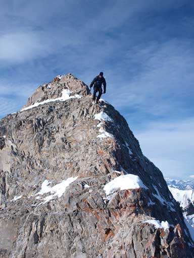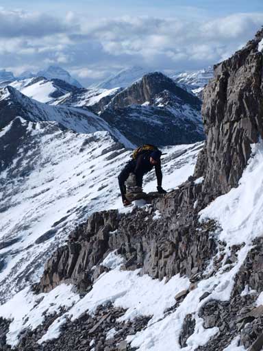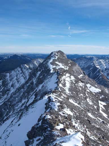 It was a bit windy on the summit, so we didn’t stay long. We tried to follow the exact ridge crest down the East Ridge, over a couple of slightly exposed sections, then up a scree ramp to another high point. Now as Nugara mentions in his book, things start to get trickier.
