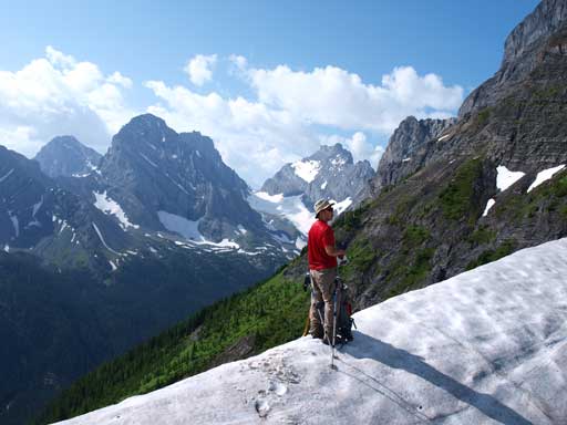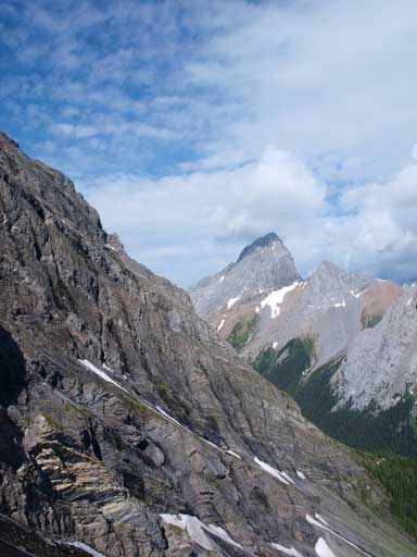 The view was foreshortened. It was still a slog to get up this gully. When we arrived at the saddle, we were treated with a spectacular view to Mounts Cegnfs, Murray, Smith-Dorrien and Robertson, as well as the upper slope. We took an energy break there.