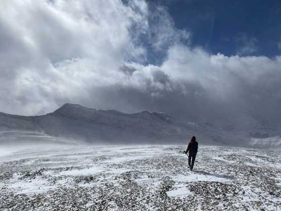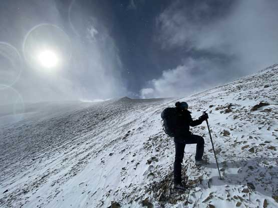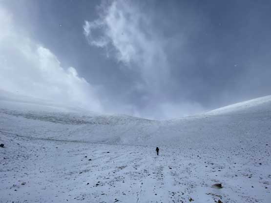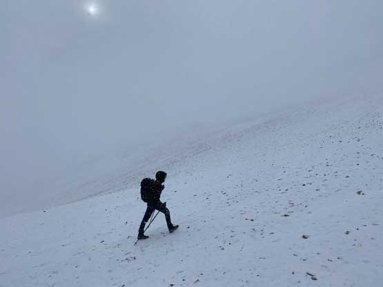 Winnie plodding up above Glasgow/Cornwall col in snow storm