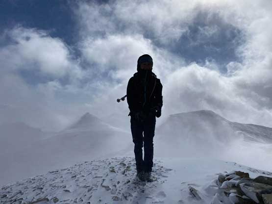 The weather had been a mixed bag so far. We started under some bluebird skies but now at Glasgow/Cornwall col we were soaked in a snow blizzard with virtually zero visibility and horizontal wind gusts. Thankfully the temperature wasn’t too cold. The plod up Mt. Cornwall from Glasgow/Cornwall col was pretty straightforward even in the conditions we had. We did have to deal with some loose and slippery terrain especially nearing the ridge crest, and once onto the ridge we got hammered by some very strong winds. We had to fight hard to maintain balance in this wind. The upside was the clearing trend in the weather and by the time we approached the summit of Mt. Cornwall the blue skies showed up again and the snow storm stopped.