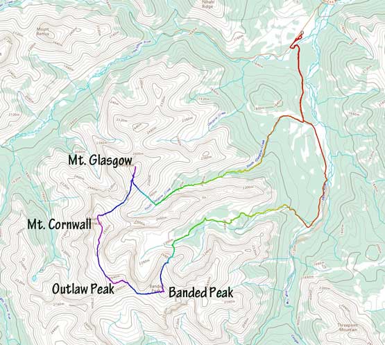Winnie on the north ridge of Mt. Cornwall now with Mt. Glasgow behind
