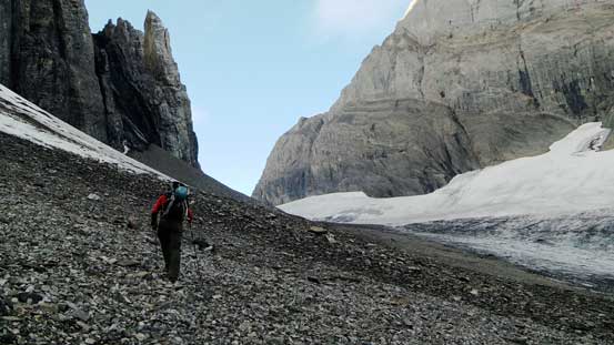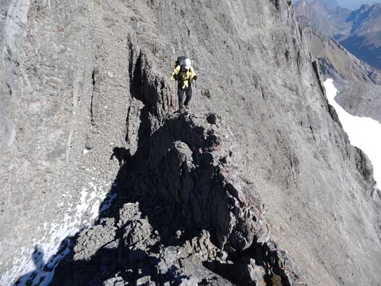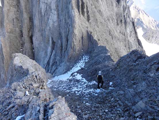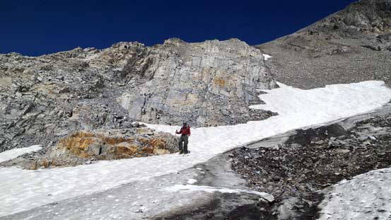 It was very early in the day so we stayed on the summit for a long time. While eating lunch Doug started to think about why not giving Piggy Plus a shot. I had some doubt about this idea as I knew by the time we got down into the forest I’d have little motivation to slog back up, so I threw out my idea – why not do Mt. Jellicoe instead. While, that would work perfectly so that’s it. After making this decision we immediately started the descent. We missed the scree ramp just above the crux and had to down-climb some loose and exposed terrain on the ridge crest. Nothing too terrible though. Back across the crux was a little bit more interesting than on the way up thank to the little bit down-hill factor. Back at the first avoidable crux we all picked the directly knife-edge line fore more “fun”.. The scree surf down the SW slopes was fast and furious but there were a few shallower or slabby spots to give us a bit of surprise if not paying attention. Snow had softened considerably but there’s minimal snow coverage so we still had to strap the crampons on.