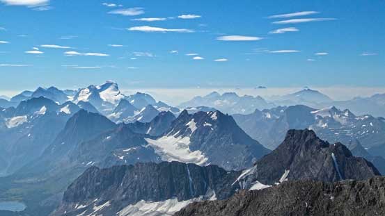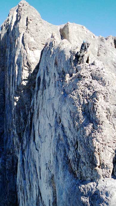 Right at the start of the ridge we had to dip down a little bit. Here we had two choices. I picked a line down skier’s left on scree or snow while Doug tackled the direct knife-edge ridge. That gave him a bit of warm-up for the real crux. After this bit there’s some moderate but very loose terrain to overcome before the false summit. Then a bit of easy ridge walk brought us to the crux – “French Guillotine”… At places the ridge narrowed down to within 1 feet with shear drop-off on each side. While there’s absolutely no room for mistake, there’s little hands-on climbing involved and we both got through quickly. Immediately after that we left the ridge crest and picked a traversing line on scree to intersect the ridge up high. The directly line would also work but more difficult. The last bit to the true summit involved ascending a loose gully. Thankfully all the snow had melted in this shady place and it was only class 3 scrambling for us, and soon after that we stood on the summit, with incredible vistas all around.
