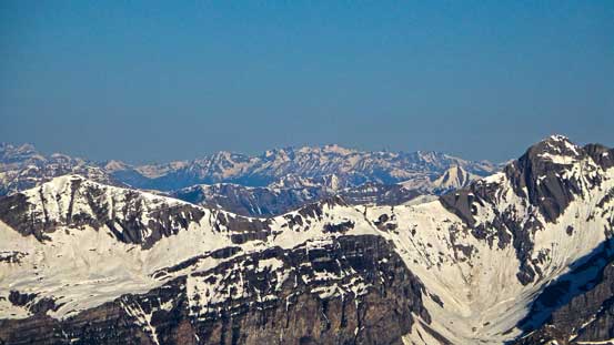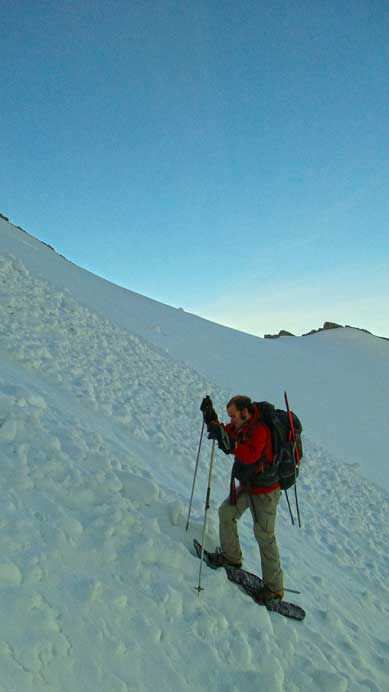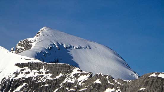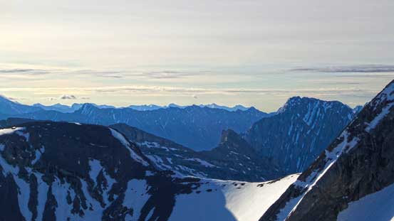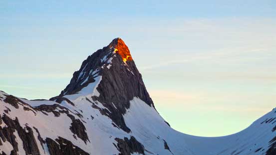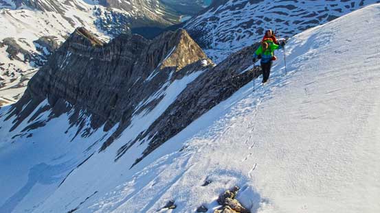 The slope looked ridiculously steep near the top, and part of it had already slid. After a warm but clear night, there was a good freeze, but certainly not full-depth. We woke up at 4:15 am and quickly broke camp and headed towards the ascent gully. It was already bright (thank to the long daylight time), but still early enough to allow us up and down the dangerous slope before sun hit it. At the base of it we ditched unnecessary gears and proceeded up with a light pack. Like the day before, we decided to snowshoe up as far as we could rather than kicking-step or post-holing. This proved to be a correct decision for the lower gully which was about 30 degrees. This is the perfect slope angle for snowshoeing straight up. The upper slope was steeper and we should have switched to crampons and ice axe. Obviously we didn’t so punished ourselves with a short sketchy section just before cresting the summit ridge. We made it nonetheless so that was okay.