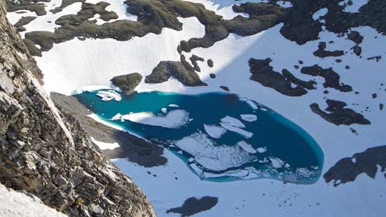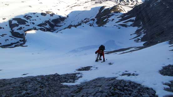Descending the summit ridge was awkward but we soon made to where we ditched snowshoes. Switching to crampons on a narrow ridge was also awkward but we somehow managed to do that without losing any gear. After that we dropped down the steep face. At the steepest part we had to front point on the slope and face inwards (that’s why snowshoeing up that section felt very sketchy)… Lower down we plunged down the rest of the slope/gully. It was quite hard on the knees though was we had to absorb all the momentum due to the hard snow. Occasionally we post-holed through the crust and that wasn’t fun neither. Oh by the way, the upper slope was actually on a small glacier so don’t think you can easily scramble up from this side. The scramble route goes up the right hand side ridge and is quite exposed.
