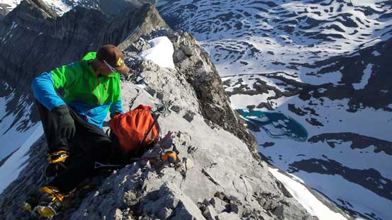 The mountain wouldn’t give up easily neither. The summit ridge, though short, was quite loose and exposed. And just before the summit we had to cross another tricky snow slope with a massive cornice on one side and dangerous run-out zone on the other side. Again, we should have at least taken out the ice axe here but the snow was just soft enough to kick step across. Soon after that we were on the summit, celebrating Vern’s 400th. That’s a great achievement!