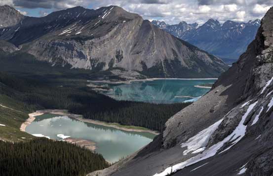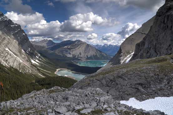 Back down to where we ditched gears, the rest of the day was a long slog back to the parking lot. It was sunnier and warmer than the day before so the snowpack was considerably weaker. Thankfully we had snowshoes to keep us floating on top (otherwise could be waist deep wallowing). I think we still missed part of the trail but overall we picked a better line through the disorienting part on the return. And then crossing back the exposed snow slope felt more awkward thank to the downward motion. Lower down we used snow as much as possible to reduce the impact on our knees. Eventually we made back to Upper Kananaskis Lake. The rest of the way back wasn’t nearly as fun though as we kept going uphill on this poorly designed trail. There’s a major uphill just before the trail joins Three Isle Lake trail that proved to be brutal, but overall it’s not a very long way back.