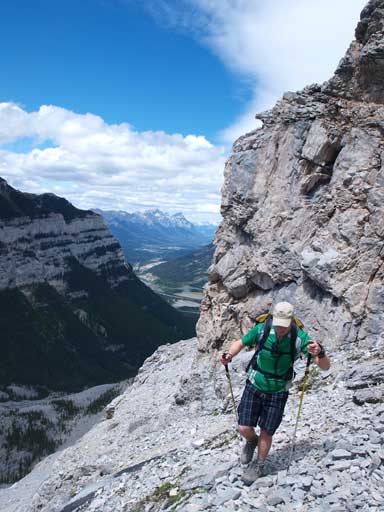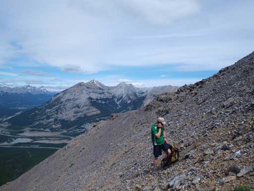 Due to the great weather forecast, we felt like an early start wasn’t necessary. The trail-head is more obvious than I thought would be, and we had no problem locating it. It’s also the trail-head for McGillivray Canyon if you know where that is. After following an old road in for a couple minutes, we started the bushwhacking. The worst bit was near the beginning. You probably want to find a weak spot otherwise the first 50 meters or so would be very miserable. We did locate a thin spot. The bush was generally not bad. It’s a typical Canmore styled open forest. We managed to stay climber’s right to avoid the mossy ground in the shady spots. At lower section the trail wasn’t obvious, but higher up we came across a quite well-defined trail that probably came from near Lac des Arcs (not sure though).