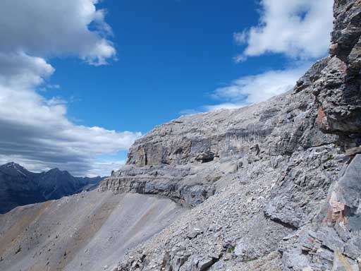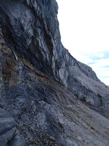 Once around the next corner we finally could see the major scree bowl and the distant summit. Here according to Andrew Nugara, we had two options, the difficult route and the easy route. We decided to go for the difficult route, but after making through the first chimney gaining the upper bench we decided to go for the easier one since the rock was very loose. Down-climbing this chimney was a bit awkward but still managable. Traversing around this bowl was slightly better than the first one since we could generally stick close to the rock wall and there was a path that offered some flat ground rather than purely side-hilling. We probably lost at least 100 meters elevation, and once around another corner, we would feel all of the regain. The terrain was loose everywhere and it was nearly impossible not knocking down rocks to each other. We pretty much climbed up parallel to each other. I aimed directly towards a big scree gully while Neil took a line more on climber’s left. My line was the correct one, and after gaining the crest it was the time for the summit ridge.