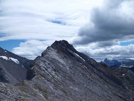 It went easy until the last bit where it suddenly narrowed to knife-edged. It wasn’t as exposed as Mount Lady MacDonald, but the crux move was more difficult since the rock was much looser. Thankfully the crux wasn’t long and we soon stood on its top. The impressive summit immediately towards south is unnamed.