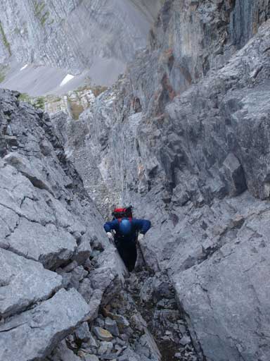 The “Step 2” involved two separate chimneys, with the second one involving one tight 5th class move (according to our reference on summitpost). Both of them are on climber’s right side of the ridge crest and should be clearly spotted. To get to the 2nd chimney, we had to cross a downsloping exposed scree covered slab ledge.. We used extra caution on our footings here. Upon arriving at the crux move I chose to squeeze in and pull up use arm strength. Grant chose to firstly ascend the ridge side, which was probably easier but much more exposed.
