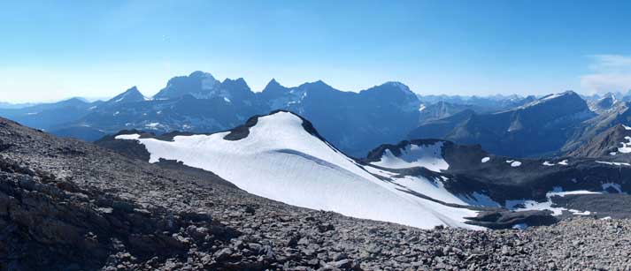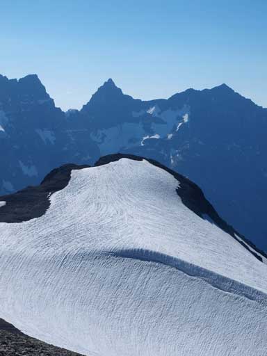 We descended from Mount McHarg, towards skier’s right and I don’t think there’ll be any issue  on the mile glacier in between. We quickly made our way down to McHarg/Worthington col. From there, it was a 10min slog up the tedious rubble slope to Mount Worthington. The view down towards Three Isle Lake is the most attracting.