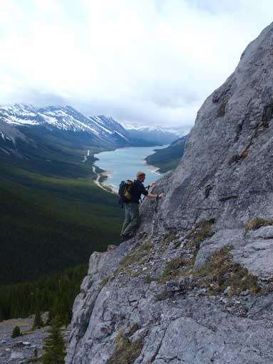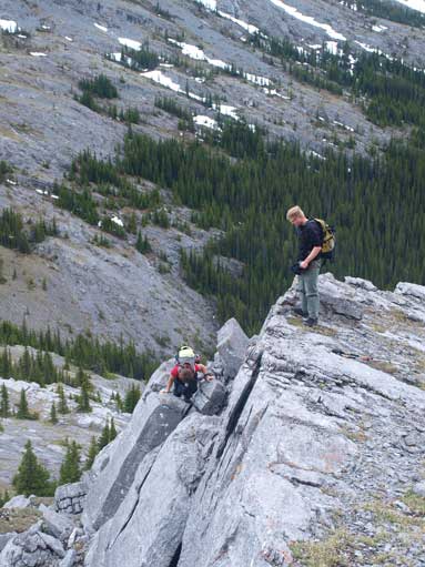 Not far up, we encountered the first difficult section, a 3 m rock band. This provided a good warm up for the later use. At this section we caught up a group of three Calgarians also attempting the same route. The ledge was mildly exposed, and 5 of us didn’t have problem to traverse it. At this point, we had a high hope that this route would work. However, soon after traversing around the ledge, a big wall appears in front of us… It’s about 15 m high, with no apparent ledge or weakness.