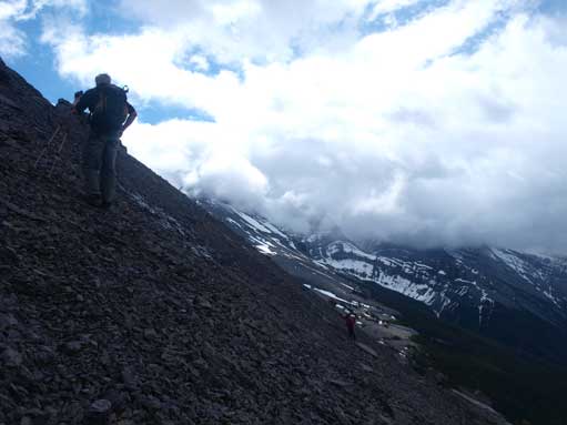 Since we had already reached this point, we didn’t want to turn around unless it’s practically impossible. Well, it’s only 15 m high though. Even if it’s a lower 5th class rock climb, I would rather solo it then turning around. None of us brought helmet so at the base of the band, we each took a different line up. Andrea took the rightmost line, while Neil descended slightly towards left and found a way on that side. I took the most direct line which was a crack. Due to the potential fatal consequence if I fell, I tested every hold before grabbing of stepping on. At the top of the crack, I had to traverse slightly to the right with very small holds on solid rock, followed by a friction move to get through. This part is definitely a 5th class terrain. I felt more like doing bouldering in gym on a vertical wall, except for no protection and questionable rock quality. I can’t command on Neil and Andrea’s route. Andrea’s route might be the easiest as she topped out the first. The two Calgarians traversed further right but we never saw them after the rock band, so I’m assuming they didn’t make it through.