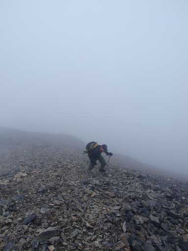 We all relieved after finishing this section, but what was waiting for us was, a long tedious rubble slog and side sloping. The brisk sized rock is the worst type. You gonna be patience here. After a long slog we crossed the alternate descending gully, and after that, the rock quality improved dramatically. However, looking back, we could see a storm was coming in. The summit was already soaked in. We tried to beat the rain, but looks like it’s going to beat us. Ten minutes later, we were in a white out, and surprisingly what was felling on us was snow, not rain. There are several 2-meter rock bands on the summit ridge, but nothing tricky. Another 10 min later we were standing on the summit. Now, the miracle happened. The sky started to clear and the layered clouds added drastically to the view. There was no summit register and we did a long summit stay before heading down.