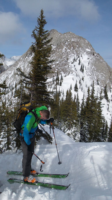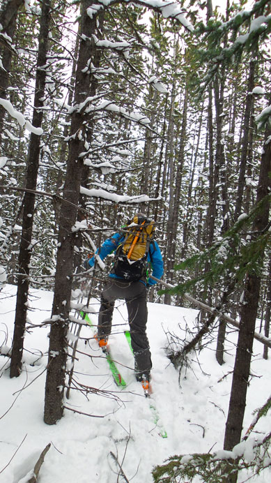 From here on the next 3-4 km was bushwhacking on flat or downhill terrain. Except for the last part, the bush was much better than expected and we were glad to pick skis for this trip instead of snowshoes. It was more like skiing through an open forest. The elevation loss was frustrating though. Everytime we thought we’d lost enough elevation, there’s always another roll showing up and we had to lose more. We certainly felt we’d lost more than 100 m elevation, oh well… Towards the last dip, bush started to get thick and skiing became pretty miserable. Thankfully this section wasn’t too long, and once we finally started going up again the bush also got better. There was more elevation regain before treeline than expected and at one point we made a mistake of ditching skis. It appeared we were pretty close to the scrambling part but actually not. We had to come back to get them due to waist deep post-holing higher up. After this bit of ‘detour’ we managed to skin to the farthest we could before eventually switching to bootpacking.