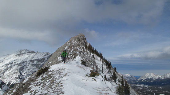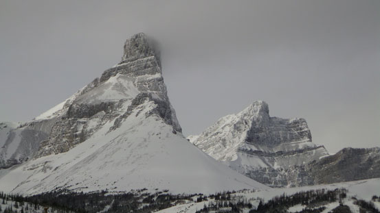 Spoon Needle is a nick name of a small, but impressive looking ridge at the center of Kananaskis Country. Its “needle” or “spire” shaped ridge attracts me every once I drive northwards on Highway 40. Judging by the entries in the register, this rarely visited summit in the past decade just started getting more popular in recent years. A couple trip reports showed up one after another. Apparently people have tried many routes on this small peak and the advantages and disadvantages of each are getting clearer. Due to the presence of raging Kananaskis River, one needs to either approach via Galatea Creek which is bushwhacking from hell, or slog a long way up Fortress ski hill road, bushwhack while losing some elevation to get to its base. For the ascent itself, the south ridge, though with considerable exposure, is much easier than the north ridge and is the only feasible route in winter.