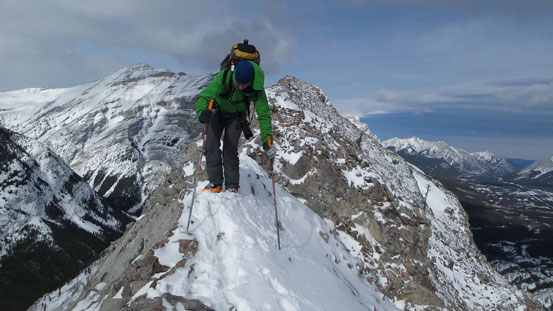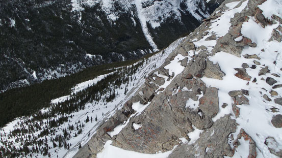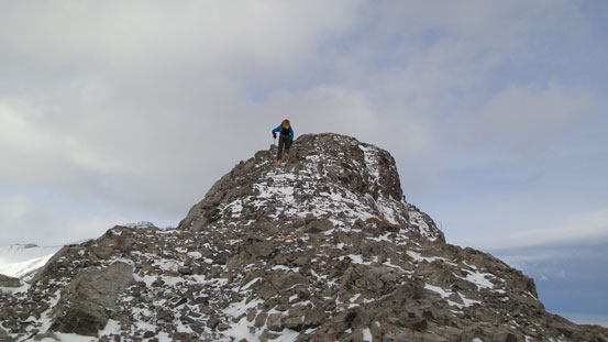 The start of this ridge was scree bashing but it soon got better. It also narrowed down higher up and the steep slabs on each side started to remind me Opoca Peak which we attempted a couple weekends ago. Unlike Opoca which has a big vertical rock face blocking our access to the summit, this one never gets too technical. There were two short sections narrowing down to within 1 feet, with the second one being quite tricky. The climber’s right side was steep thin snow covered slabs and offered no grip on the ski boots, and we had to rely on a couple loose holds on the left side while dealing with significant exposure. I didn’t remember people talking about difficult scrambling on this ridge but I guess it all depends on how much snow on the ridge. The summit arrived shortly after this bit of excitement.