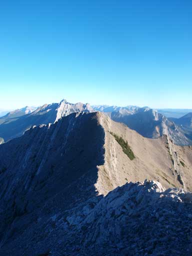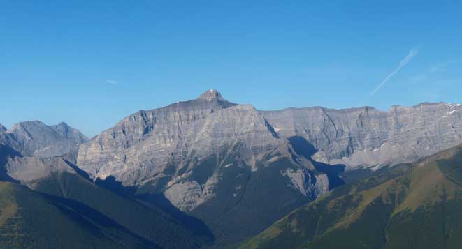 I’m glad we got the most significant elevation gain in the shade, as it was forecasted to be a hot day. We didn’t bother to do the lower north summit, instead we immediately went down towards Wasootch/Kananaskis col. Summitting Wasootch Peak via its normal scramble route was just the warm-up of this traverse. The fun parts were just about to begin. Next objective, Kananaskis Peak.