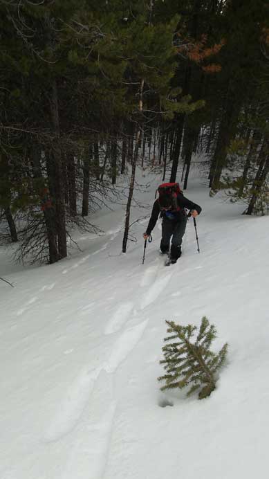 Sonny Bou and Bob Spirko ascended it a couple weeks ago and we’d use the same route as they did. I also armed with their GPS tracks. Apart from a short dip not far into the trip, the route was fairly simple – just going up. The bushwhacking was nearly non-existent probably due of the thick snowpack. Sometimes my poles could punch entirely through without touching the ground. It’s amazing to see this amount of snow in the foothills in April, but oh well. That kept us free of dead-falls so I wouldn’t complain too much about it. The snow also held nicely. On a warm day like this we would expect lots of post-holing in isothermal crap but it wasn’t the case. There was some knee deep post-holing on steeper rolls but in general it was tolerable.